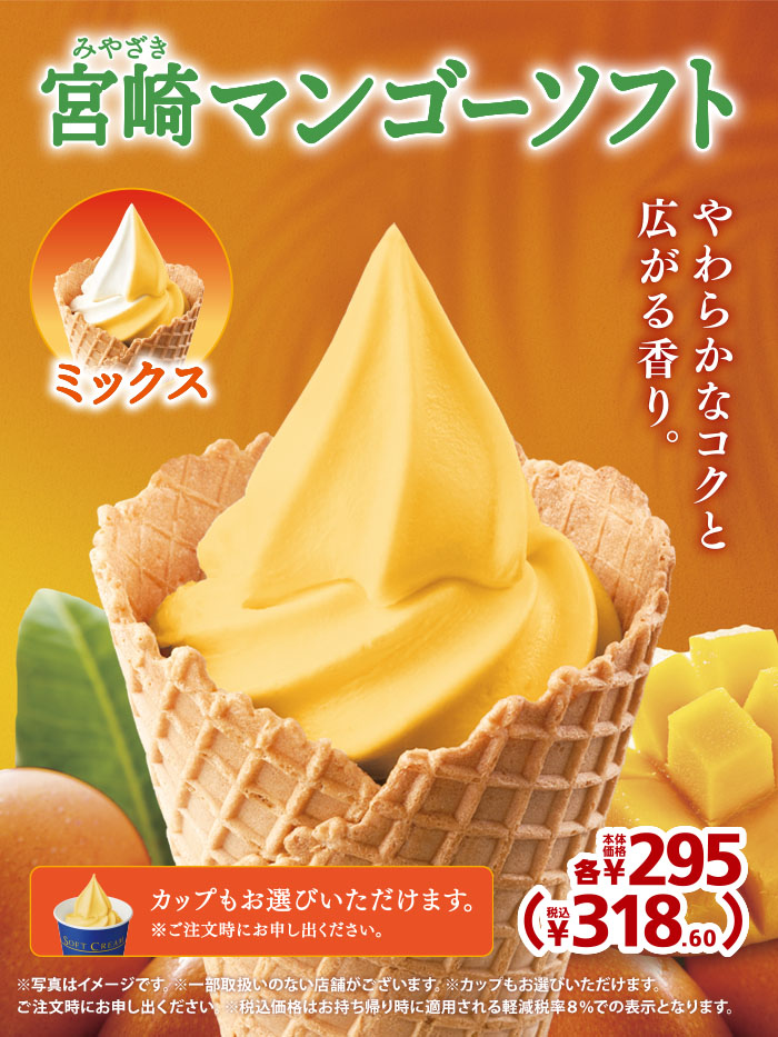 今なら宮崎マンゴーソフトとミックスが本体価格から50円引きで食べられるYO