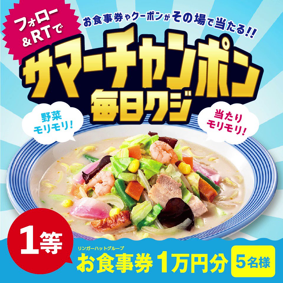 おはようございます。2022年06月24日 10時00分(金曜日)「リンガーハット」の最新情報をお知らせします。サマーチャンポン毎日クジ10日目