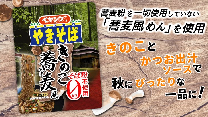 蕎麦粉を一切使用していないペヤングオリジナルの「蕎麦風めん」を使用した商品です✨だしの効いた醤油ベースのソースがきのこの旨味を引き立て秋にピッタリの味わいに仕上げました