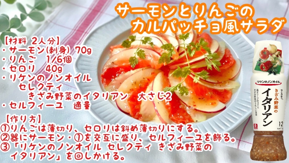 新商品『リケンのノンオイルセレクティきざみ野菜のイタリアン』を使った彩りが綺麗なサラダ✨