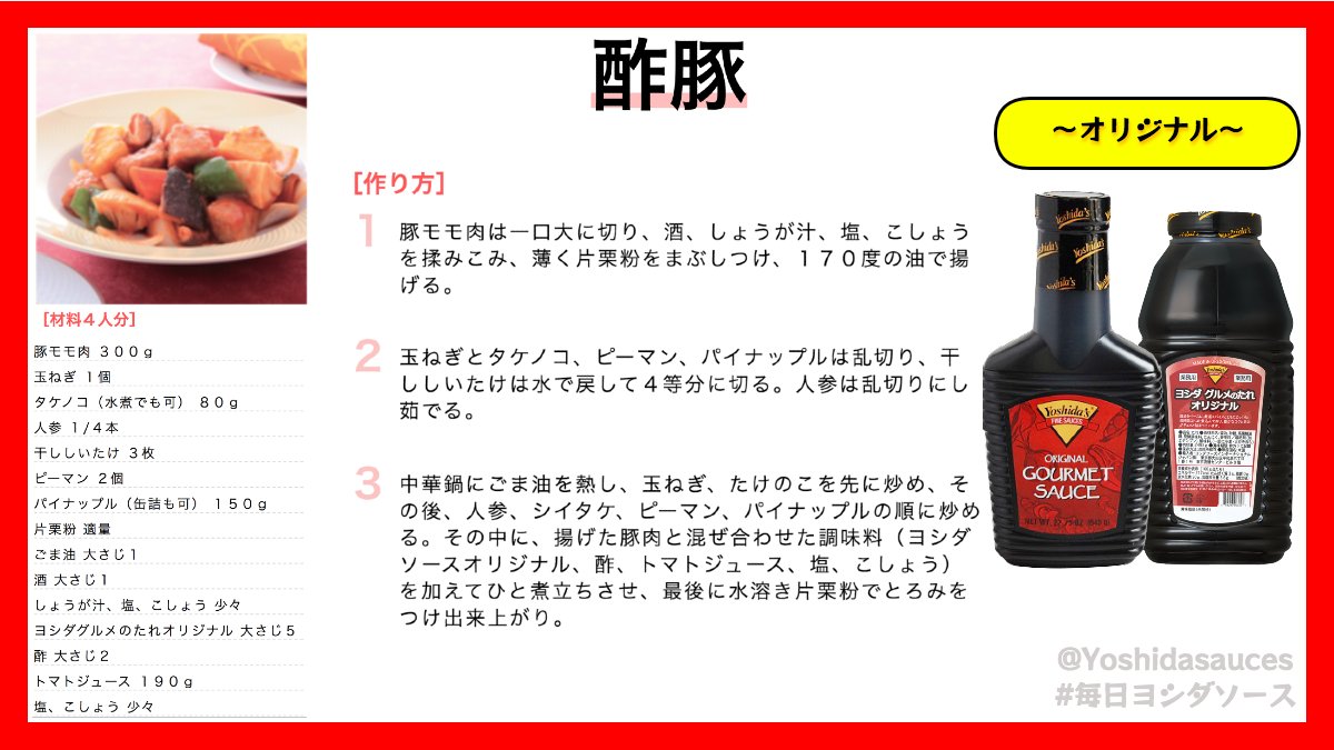 本日の毎日ヨシダソースは「オリジナルソース」を使った「酢豚」です!️