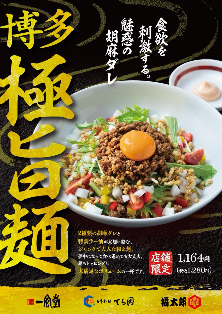明日8/5(金)より6店舗で胡麻ダレベースのピリ辛汁なし和え麺「博多極旨麺」を期間杯数限定販売します!
