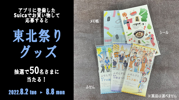 NewDaysアプリに登録したSuicaPASMOで期間中にお買いものしてアプリ内のスタンプカード画面から応募すると「東北祭りグッズ」が抽選で50名さまに当たる