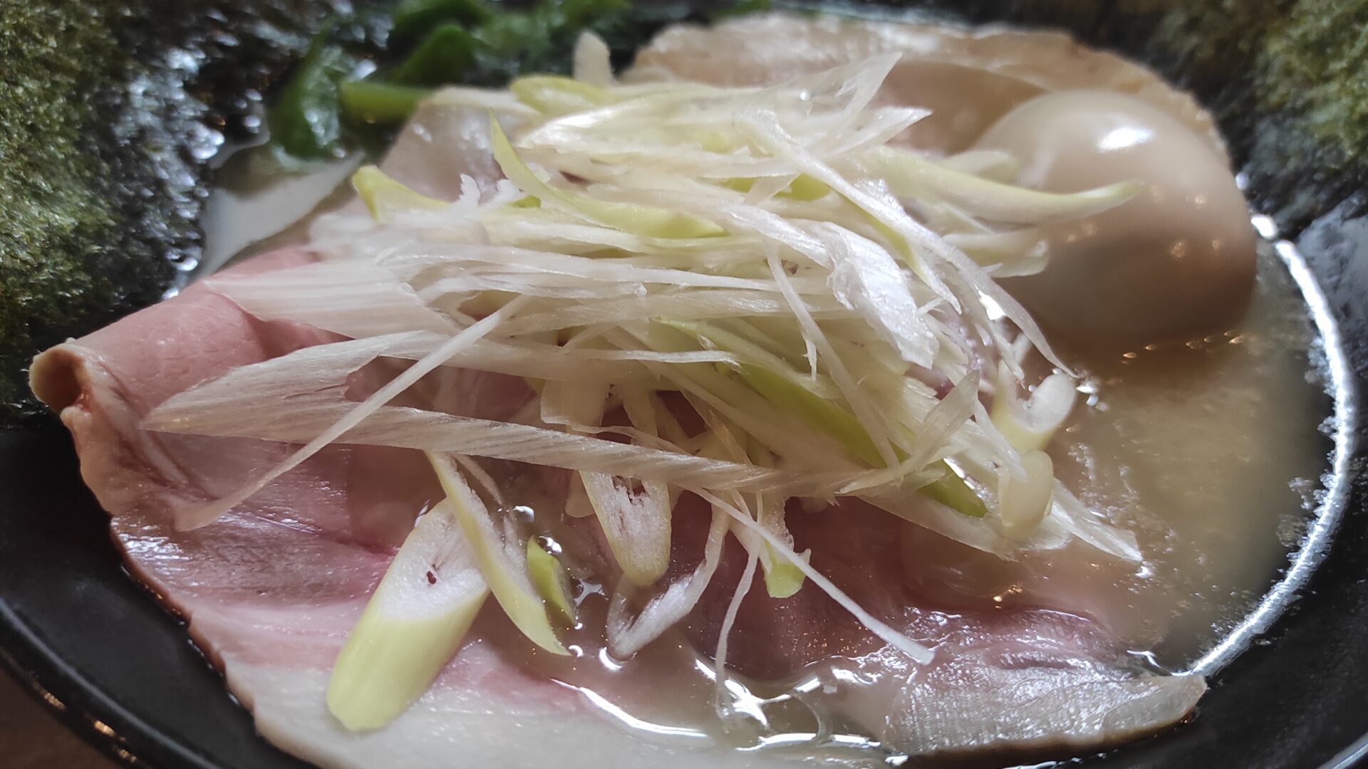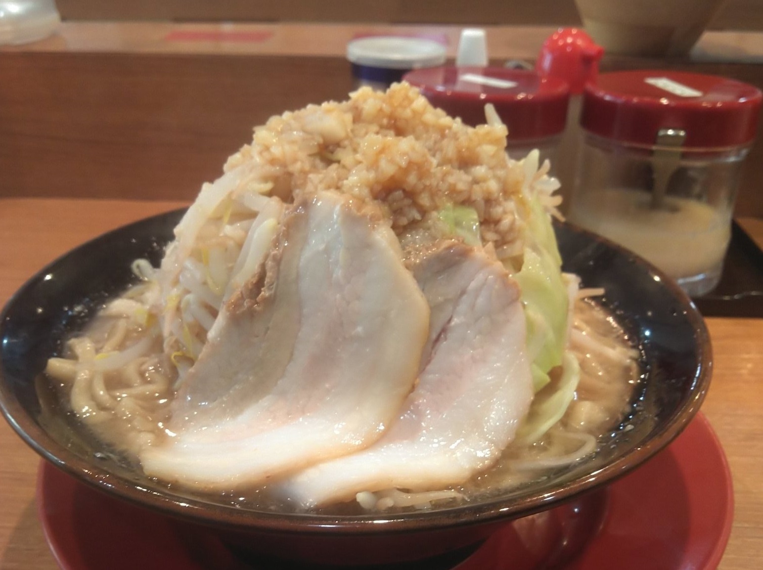 トロッと濃厚な豚骨スープ。味はそこそこだが刻み玉ねぎやニラからしなどの卓上調味料が多いのが嬉しい。チャーシューはホロホロに煮込まれたバラ肉タイプ。