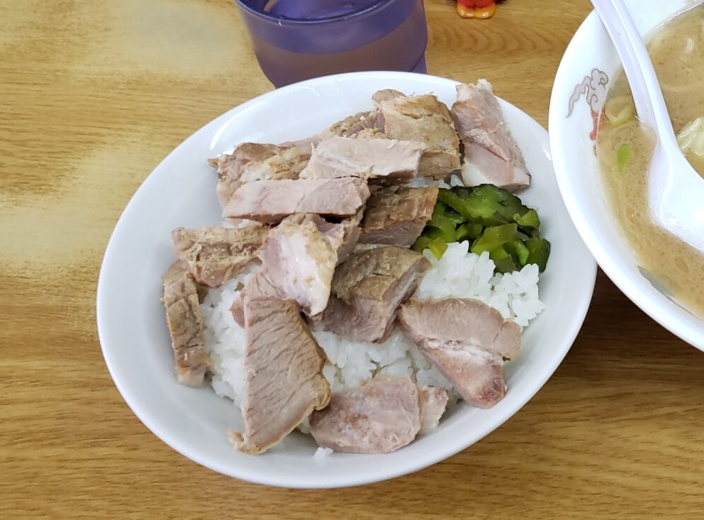 開店時にチャーシューの切れ端サービス ライス注文時の青かっぱ(キュウリの漬物)セルフ |
