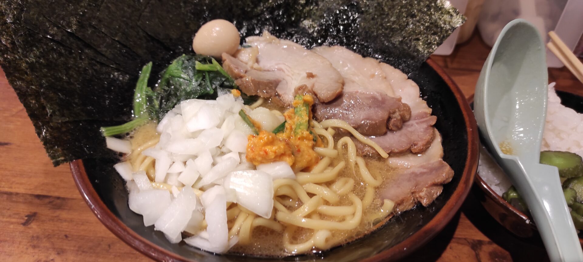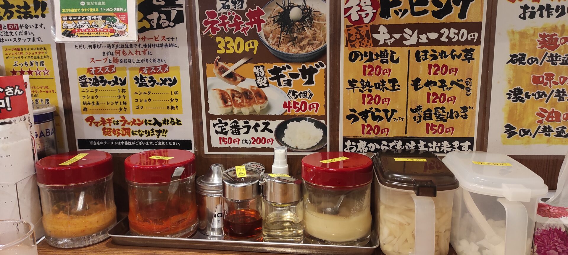 日の出町の駅前にある極味家に行ってみました。以前から気になってはいたのですが、この手の看板やポスターなどがゴテゴテなタイプは美味しかった記憶がないので躊躇していました。 行者にんにくなどはないが卓上調味料は豊富。刻み玉ね … 続きを読む 極味家は濃厚な家系ラーメン!味は…卓上の刻み玉ねぎ込みなら美味しい【日の出町 横浜市】